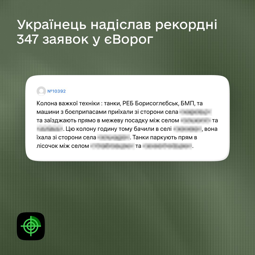 «Цей користувач — рекордсмен, бо за два роки відправив 347 заявок. Для нього — кілька кліків, а для Сил оборони — цінні дані та очі на окупованій території. Так військові попросили знайти РЕБ, ми почали збір заявок у єВорог, користувач із Запоріжжя надіслав інфу. На наступний день РЕБ знищили», — йдеться у повідомленні.