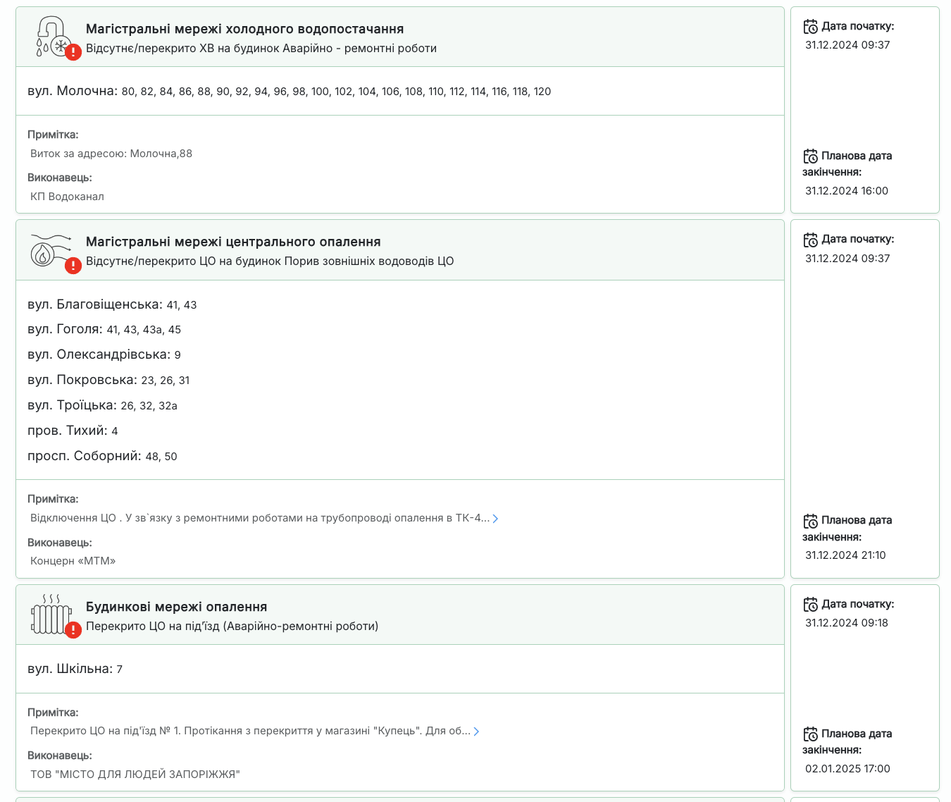 На 31 грудня 2024 року в Запоріжжі заплановано проведення низки аварійно-ремонтних робіт на магістральних мережах холодного водопостачання, системах центрального опалення та будинкових мережах.