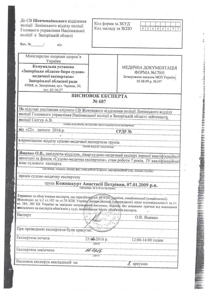 Все это происходило в то время, когда я находилась на официальном приеме у представителя власти, губернатора Запорожской области Брыля К.И. ,который во время приема 16 февраля 2016 года гарантировал что «с этого момента, когда Вы переступили порог моего кабинета, Вы под моей защитой». А в это время убивали мою девочку …