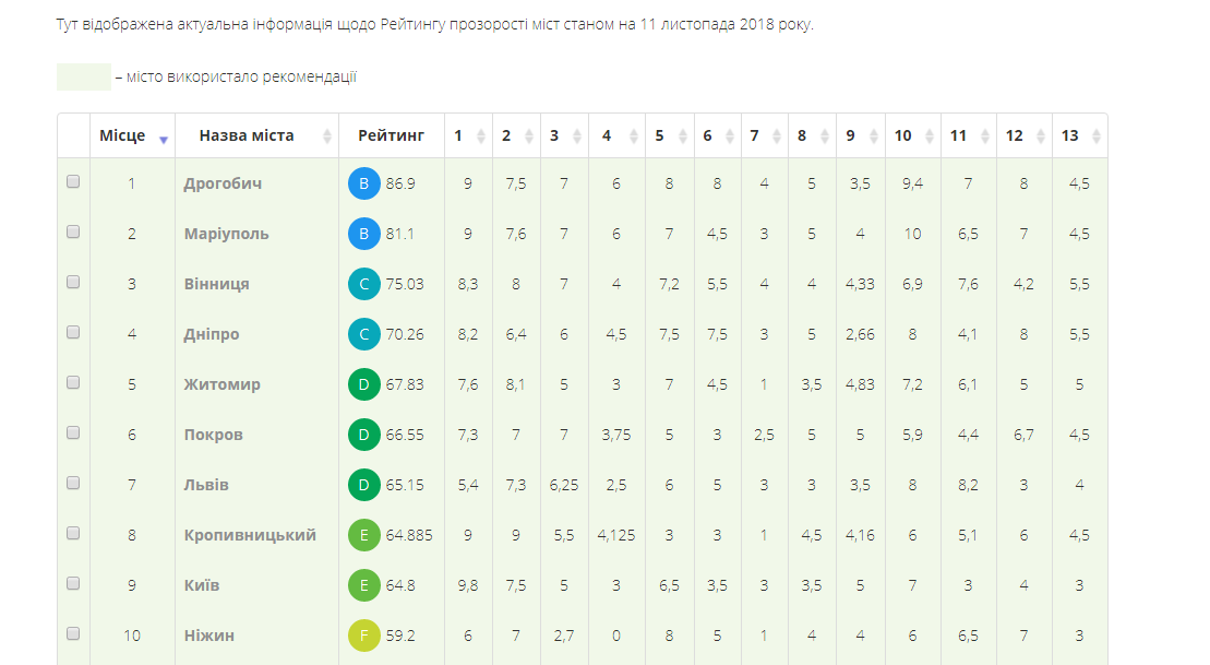 Запорожье по состоянию на 11 ноября занимает 71 место с показателем в 26,03 балла. Лидерами рейтинга являются Дрогобыч, Мариуполь, Винница, Днепр и Житомир.