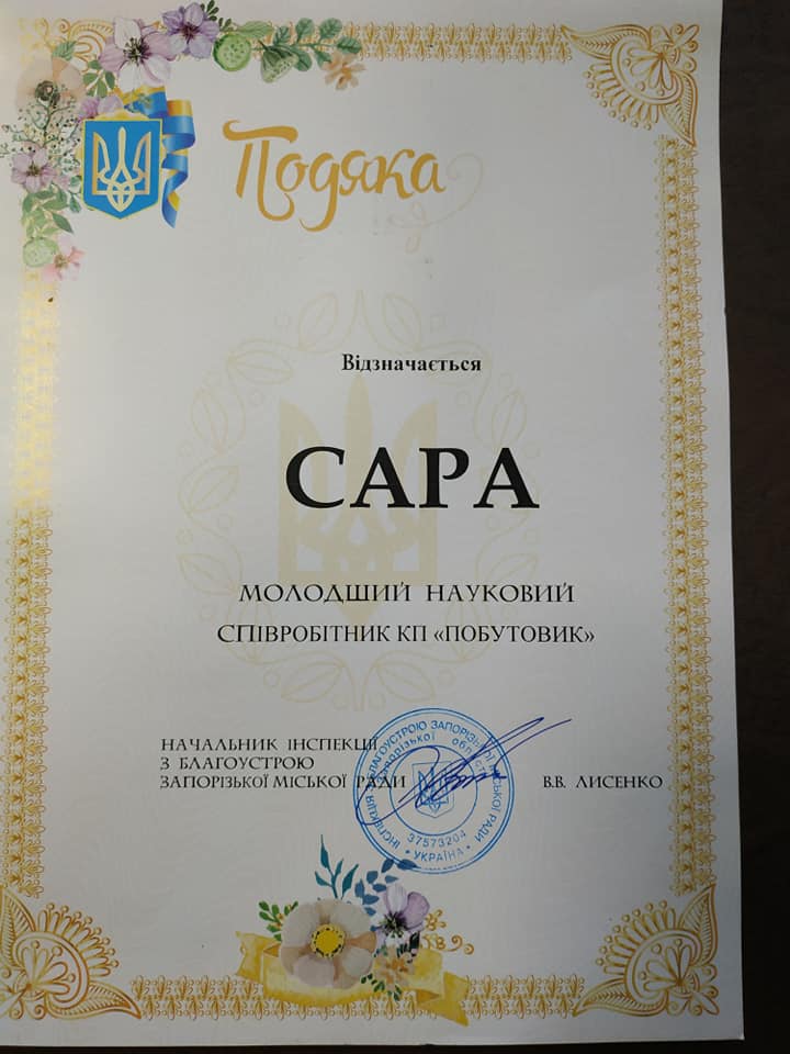 Инспекция по благоустройству от Запорожского горсовета выписала благодарность своему четырехлапому сотруднику — собаке Саре.