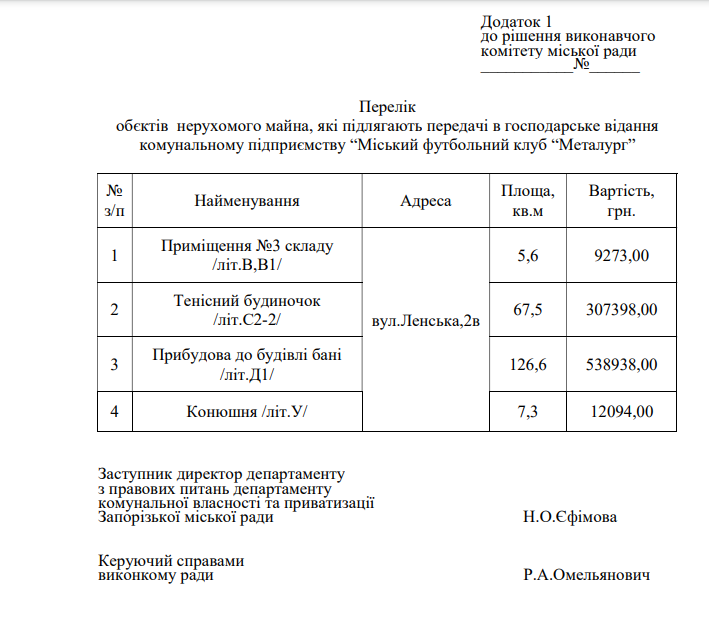 Согласно документу, учитывая обращения коммунального предприятия «Городской футбольный клуб «Металлург» и Департамента спорта, семьи и молодежи Запорожского городского совета, исполнительный комитет Запорожского горсовета решил передать КП «ГФК «Металлург» конюшню, теннисный домик, складское помещение и пристройку к бане по улице Ленской,2в. Примечательно, что пристройка к бане по своей площади сравнима с хорошим частным домом — 126,6 квадратных метра.
