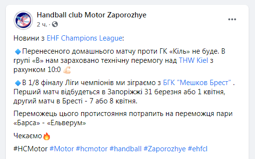 В 1/8 финала Лиги чемпионов «МОТОР» встретится с белорусским БГК «Мешков Брест». Об этом сообщили на официальной странице украинского клуба в facebook.