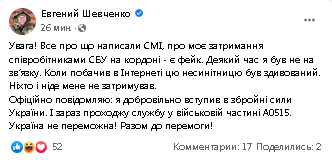 В своем Facebook Шевченко написал, что информация о его задержании, — фейк. Напомним, её опубликовали центральные украинские СМИ, ссылаясь на инсайд от силовиков.