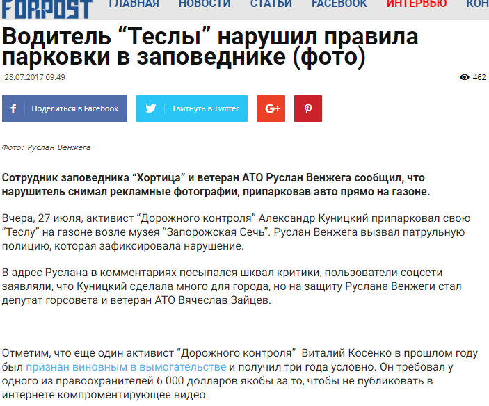 Так, 27 июля 2017 года сообщалось, что сотрудник заповедника «Хортица» и ветеран АТО Руслан Венжега сообщил, что активист «Дорожного контроля» Александр Куницкий припарковал свою «Теслу» на газоне возле музея «Запорожская Сечь». Руслан Венжега вызвал патрульную полицию, которая зафиксировала нарушение.