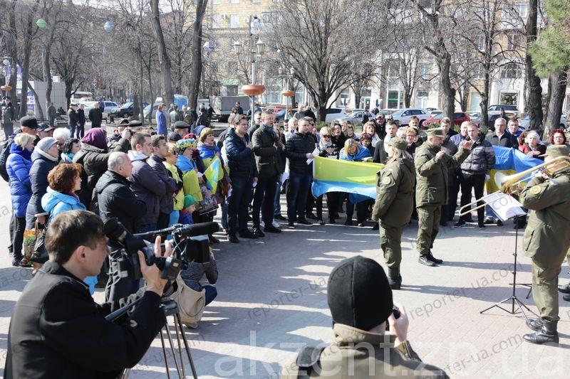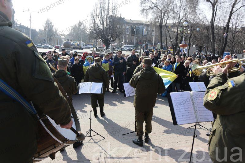 Сегодня, 10 марта, на площади Маяковского запорожцы исполнили хором гимн Украины. Во флешмобе принял участие и духовой оркестр Нацгвардии. Мероприятие приурочили к 151-й годовщине со дня первого исполнения государственного гимна.Об этом сообщает РепортерUA.