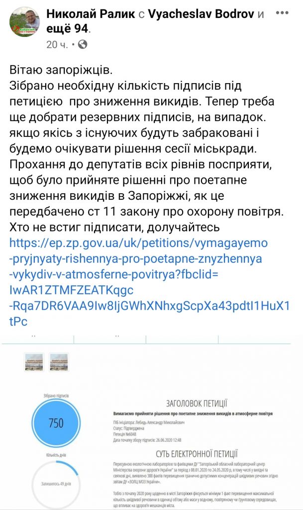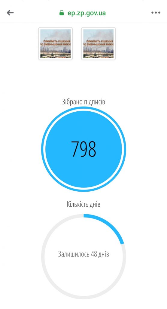 За 12 дней жители Запорожья собрали почти 800 голосов при 750 необходимых за рассмотрение петиции об уменьшении вредных выбросов в Запорожье.