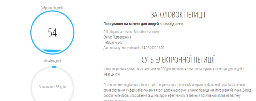 Так, инициатор петиции отмечает, что на данный момент к полномочиям инспекторов по парковке отнесено рассмотрение дел о нарушении ПДД, предусмотренные статьями Кодекса Украины об административных правонарушениях (далее — КоАП), а именно: часть 1,3 и 6 статьи 122 (нарушение правил остановки и стоянки), и часть 1, 2 и 8 статьи 152-1 (нарушение порядка и правил платной парковки).
