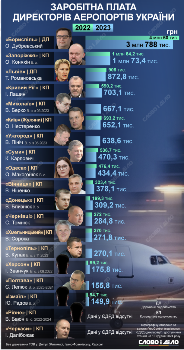 Згідно з рейтингом, опублікованим виданням «Слово і діло», у топі за рівнем зарплат опинився Олександр Дубревський, директор аеропорту «Бориспіль». У 2022 році його дохід склав понад 4 млн грн, а у 2023 — близько 3,8 млн грн. Дубревський пояснив, що основні витрати пов’язані з утриманням інфраструктури, забезпеченням кваліфікації персоналу та підготовкою до відновлення роботи аеропорту. Цікаво, що до 2021 року він обіймав аналогічну посаду в запорізькому аеропорту.