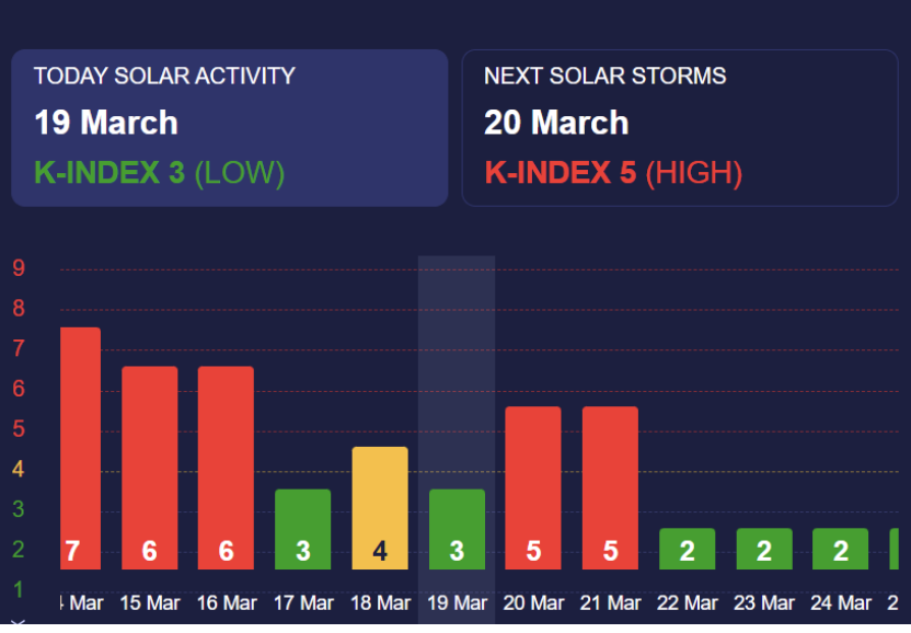 В найближчі дні очікується поява значних геомагнітних коливань на Землі, які триватимуть досить довго. Пікове загострення геомагнітної активності передбачається 20-го і 21-го березня, коли сила геомагнітних бур досягне високого рівня.