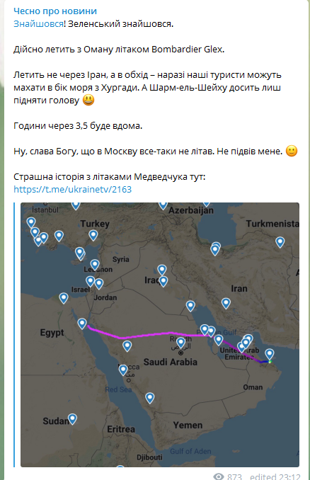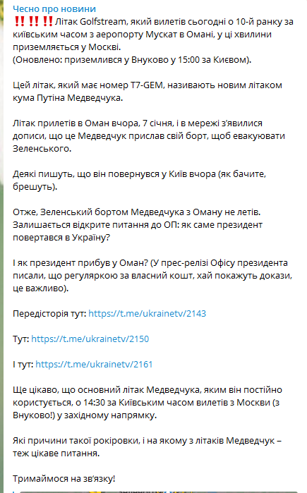 В свою очередь журналист Татьяна Николаенко в своем телеграм-канале рассказала о том, как Владимир Зеленский улетал с Омана, и что в это же время вчера из Омана в Москву совершил перелет борт одного из лидеров ОПЗЖ, кума Владимира Путина Виктора Медведчука.