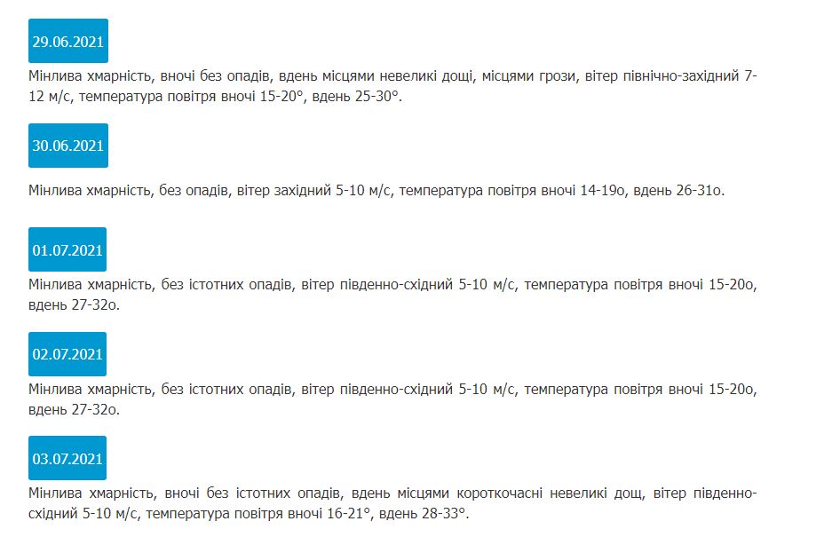 Согласно данным Запорожского областного гидромецтентра, на протяжении 29 июня — 3 июля, на территории региона ожидается преимущественно малооблачная погода без существенных осадков (небольшие дожди возможны 29 июня и 3 июля). Температура воздуха ночью будет колебаться от +14..+16 до +16..+21 градусов, а в дневные часы от +25..+27 до + 28..+33 градусов