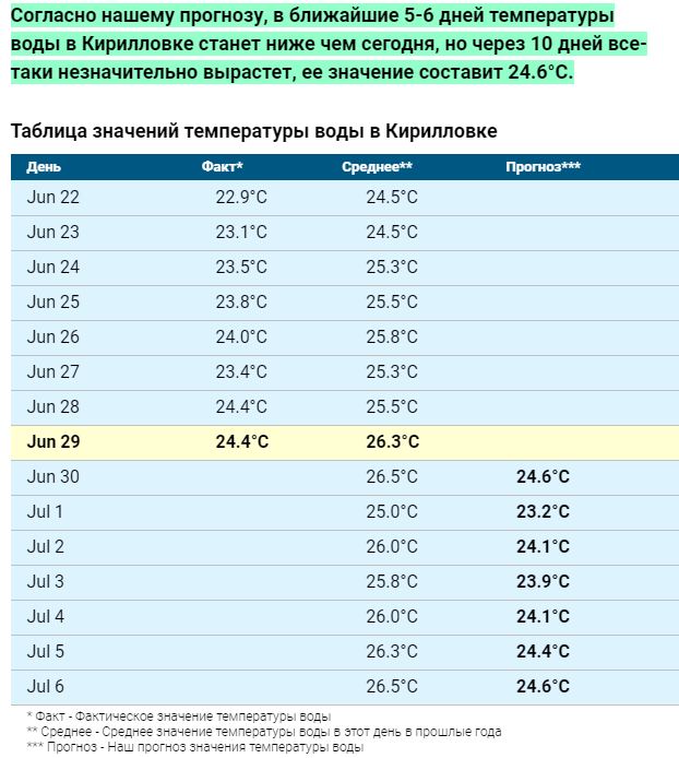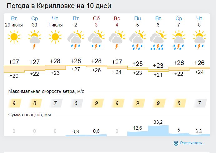 Что касается погоды на курортах Азовского моря, то в ближайшие 10 дней, температура воды, например в Кирилловке, будет колебаться от 23,2 до 24,6 градусов, что вполне комфортно для длительного купания. Такие данные приводит сервис seatemperature. Температура воздуха в Кирилловке в ближайшие несколько дней не поднимется выше +27..+28 градусов. До конца недели значительных осадков не ожидается. Дожди обещают 5-6 июля.