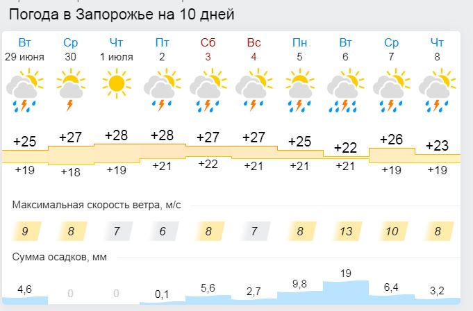 По данным Гисметео, в Запорожье в ближайшие 10 дней в дневные часы температура воздуха не будет подниматься выше +28 градусов. Таким образом ближайшая неделя обещает быть более прохладной, нежели предыдущая. Осадки в виде дождя ожидаются сегодня, 29 июня, а также на выходных — 3 и 4 июля.