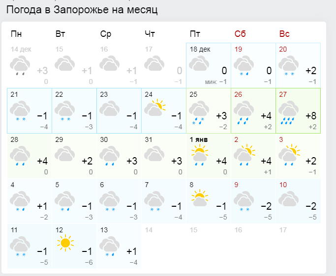 Если обратиться к прогнозам синоптиков по Запорожью, 31 декабря осадков не ожидается. Стоит отметить, что данные популярных онлайн-сервисов погоды по Запорожью в целом совпадают с прогнозом народного синоптика. Всю последнюю неделю перед Новым Годом и на 31декабря — 1 января ожидается небольшой плюс с периодическими осадками в виде дождя или мокрого снега. Как будет на самом деле — ждать осталось недолго.