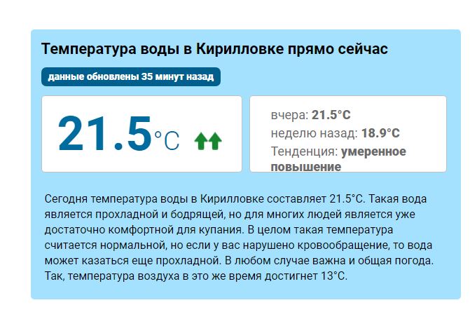 Если вы планируете на выходные поехать на море, то на курортах Азовского моря, например в Кирилловке, 5-6 июня в дневные часы ожидается до +21 градуса, переменная облачность, ветер незначительный. Дождь возможен ближе к вечеру воскресенья. Температура воды по состоянию на 4 июня на курорте составляет уже +21.5 градуса, что в целом считается приемлемым для купания. К слову, отдыхающих на пляжах с каждым днем становиться все больше (смотрите фото ниже)