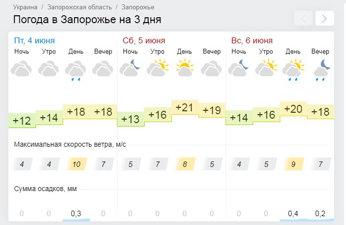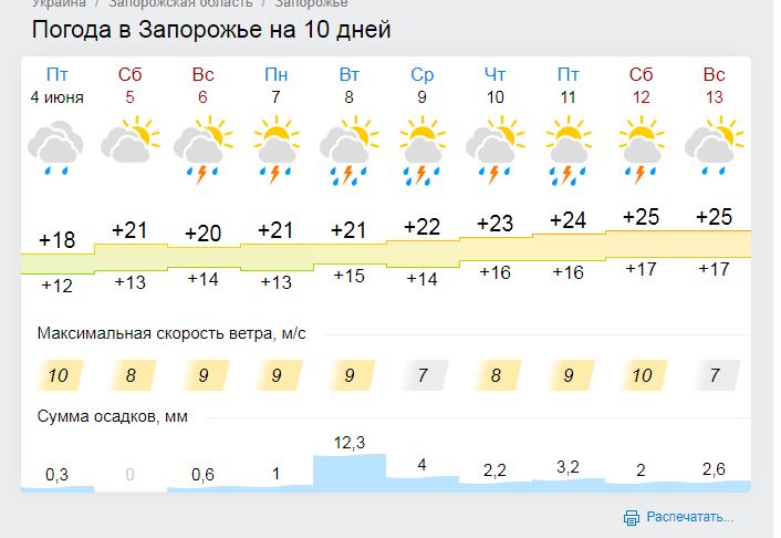 Согласно более долгосрочного прогноза погоды, то следующей неделе синоптики также обещают дожди, однако в целом температура воздуха в Запорожье уже будет умеренно летней — до + 25 градусов, а по данным сервиса Meteoprog даже до + 28 градусов.