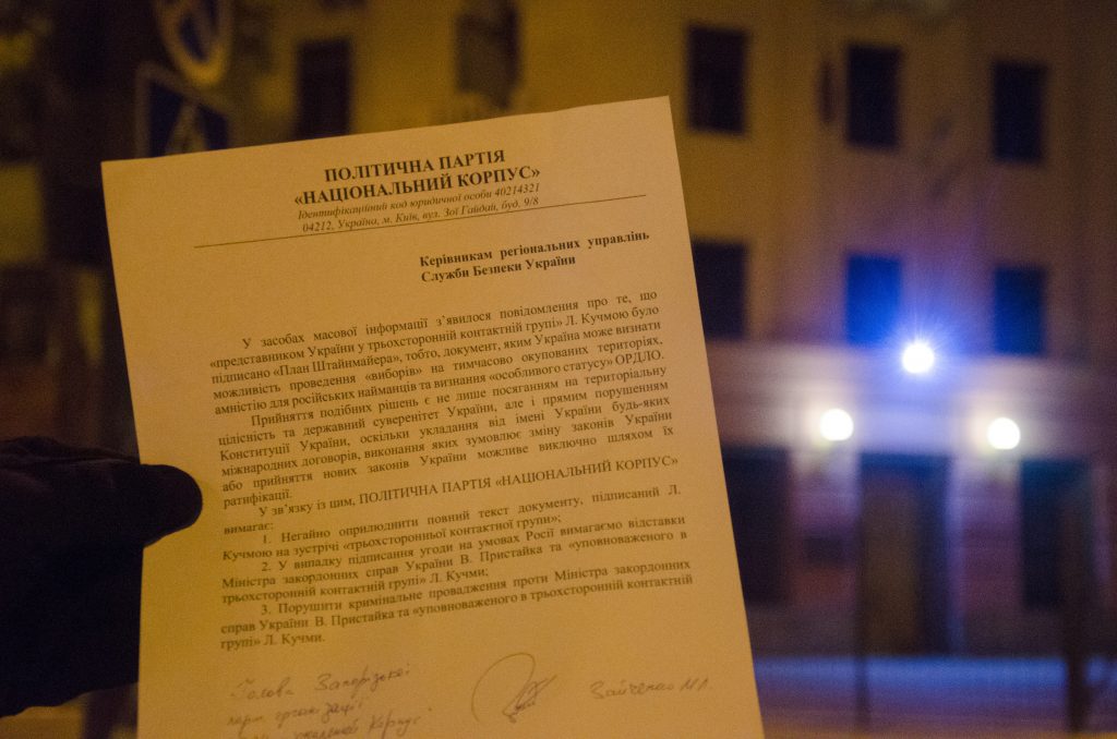 «После предательского сообщения о том, что «представителем Украины в трехсторонний контактной группе» Л. Кучмой был подписан «План Штайнмайера», документ, которым Украина может признать возможность проведения «выборов» на временно оккупированных территориях, амнистию для российских наемников и признание «особого статуса » ОРДЛО, по всей Украине прошли акции протеста. «Национальный Корпус» в Запорожье поддержал волну общественного негодования и провел ночью пикет под зданием СБУ» — пишут в пресс-службе «Нацкорпуса».