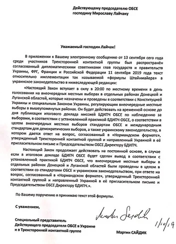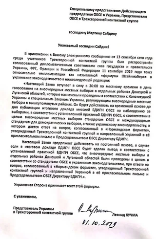 Уже сегодня, 2 сентября, письма от представителей Украины, России и боевиков («отдельных районов Донецкой и Луганской областей»), в которых принимается формула Штайнмайера, были опубликованы.