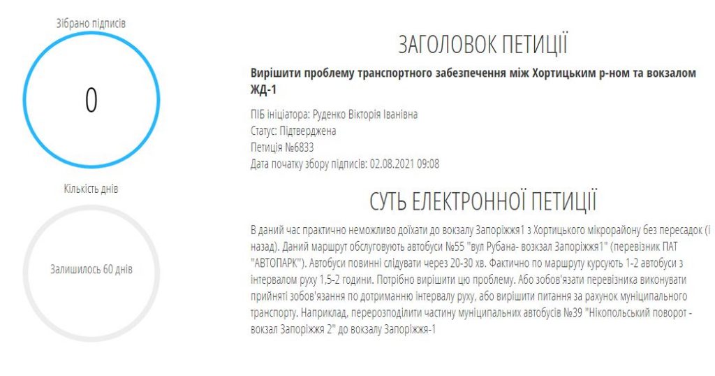 Автор петиции пишет, что в настоящее время практически невозможно доехать до вокзала Запорожье-1 с Хортицкого микрорайона без пересадок (и обратно). Данный маршрут обслуживают только автобусы №55 «ул Рубана- возкзал Запорожье1» (перевозчик ОАО «Автопарк»).