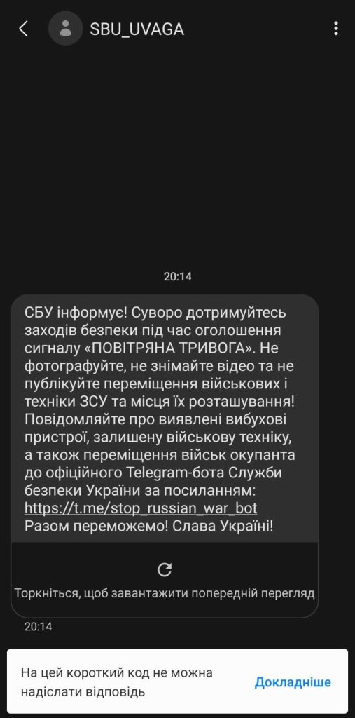 «СБУ інформує! Суворо дотримуйтесь заходів безпеки під час оголошення сигналу «ПОВІТРЯНА ТРИВОГА». Не фотографуйте, не знімайте відео та не публікуйте переміщення військових і техніки ЗСУ та місця їх розташування!