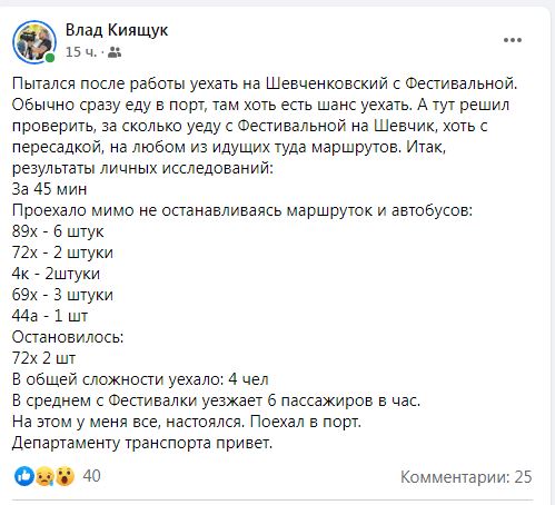 Обычно сразу еду в порт, там хоть есть шанс уехать. А тут решил проверить, за сколько уеду с Фестивальной на Шевчик, хоть с пересадкой, на любом из идущих туда маршрутов, — написал журналист в Фейсбук.