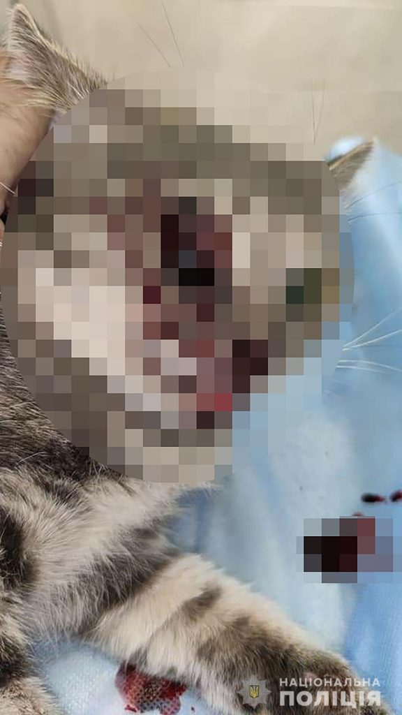 4 сентября в отделение полиции обратилась женщина-волонтер, которая сообщила, что под домом по улице Запорожской нашла искалеченную кошку. Животное скорее всего выбросили из окна. Зоозащитница увезла ее в ветеринарную клинику, где диагностировали многочисленные травмы: травматическую ампутацию глаза, тяжелые черепные и другие ранения.